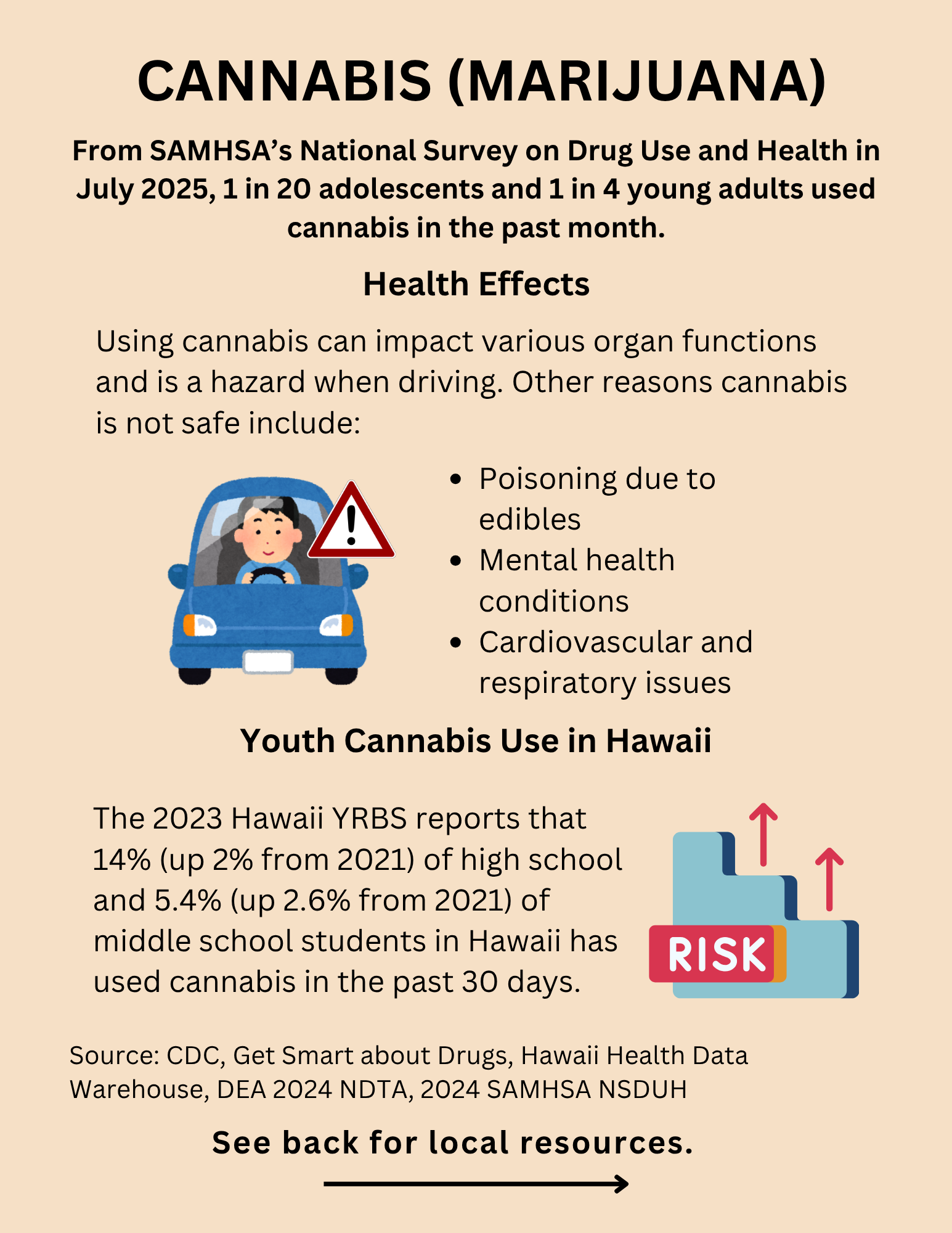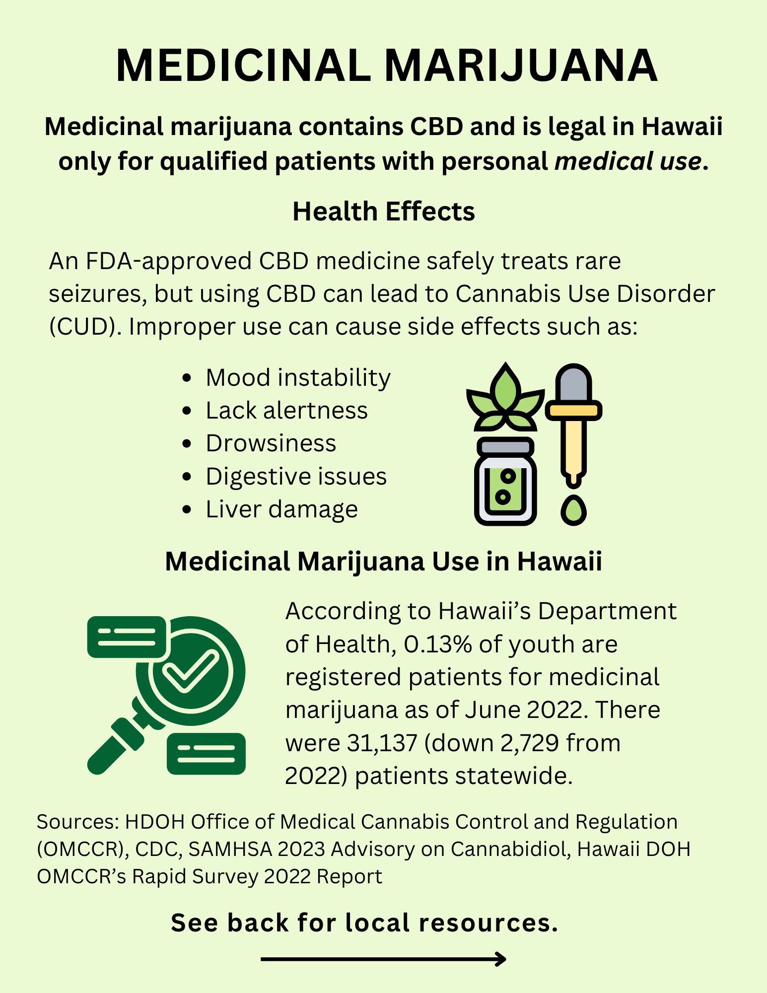 Marijuana comes from the plant Cannabis Sativa. The key ingredient in marijuana is Tetrahydrocannabinol (THC), when smoked or ingested THC causes a powerful high. Marijuana is commonly referred to as pakalolo, pot, weed, grass, maui-wowie, blunt, J, ganja, mary Jane, doobie, herbs, buds etc.
