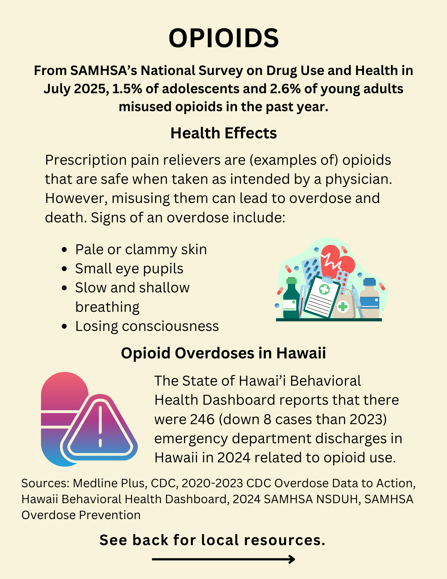 Opioids: medicines used to treat pain. Ex: Oxycontin, Roxicodone, Vicodin, Lortab, Norco